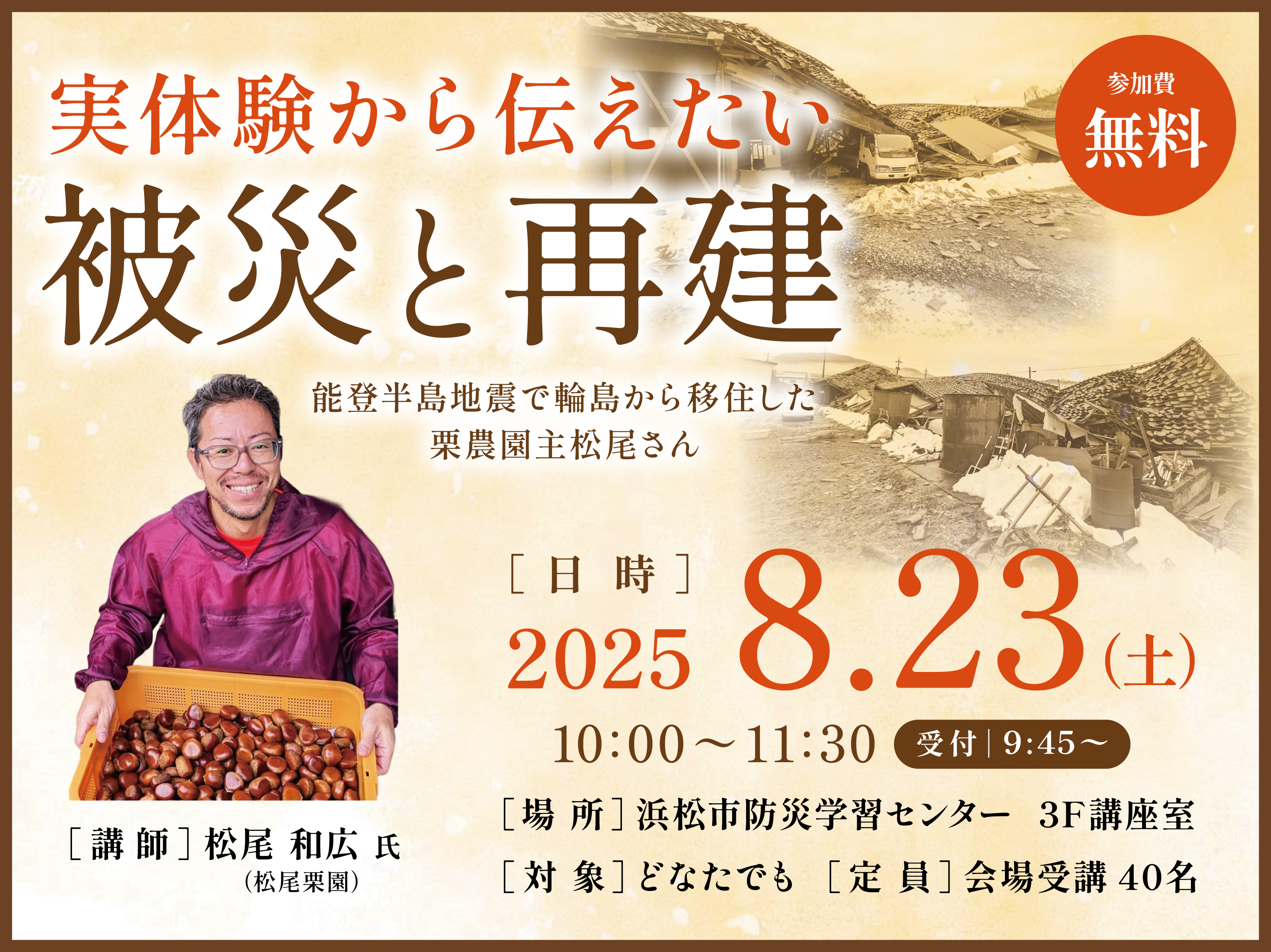 被災体験を通じて伝えたい「災害時の備え」「助かったこと」、さらに事業主の立場から見た「被災地の実情」「再建を阻む制度の問題点」など、多岐にわたるテーマについて語ります。